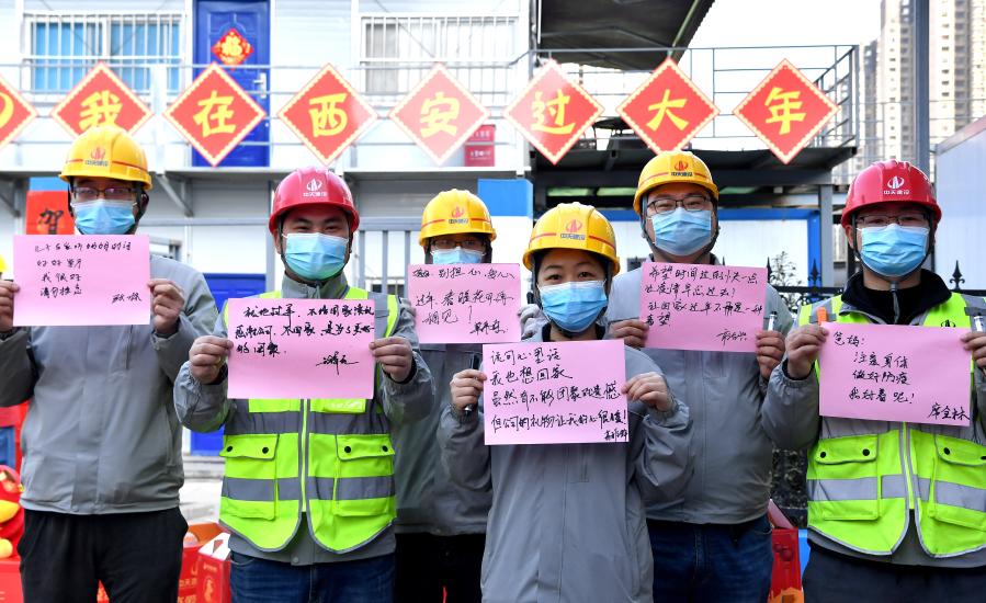2月1日,在西安中天西北集團(tuán)一住房項(xiàng)目建設(shè)工地,建設(shè)者寫下自己想對(duì)家人說(shuō)的話。新華社記者 劉瀟 攝