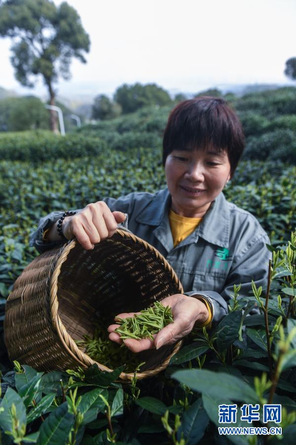 3月12日,在位于杭州市西湖風(fēng)景名勝區(qū)滿覺隴村白鶴峰的西湖龍井茶葉基地,茶農(nóng)展示剛剛采摘的西湖龍井茶鮮葉。