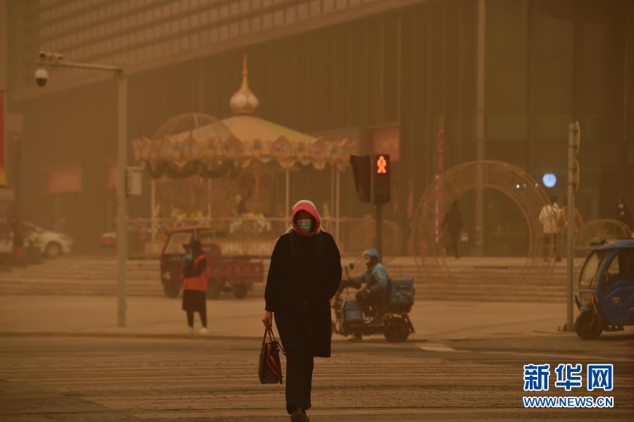 3月15日,寧夏銀川市民在沙塵中通過(guò)十字路口。當(dāng)日,我國(guó)北方多地出現(xiàn)沙塵天氣。新華社記者 唐如峰 攝