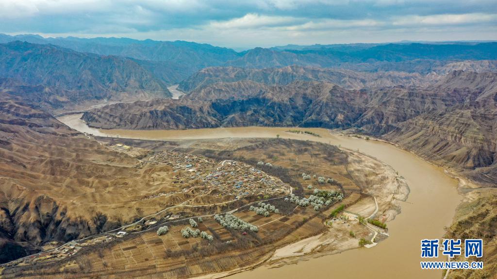 這是位于寧夏中衛(wèi)市黃河黑山峽河段的南長(zhǎng)灘村(4月4日攝,無(wú)人機(jī)照片)。