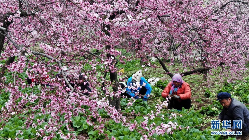 4月6日,甘肅省隴南市宕昌縣城關(guān)鎮(zhèn)玉地河村群眾在桃樹(shù)下采挖小白菜。