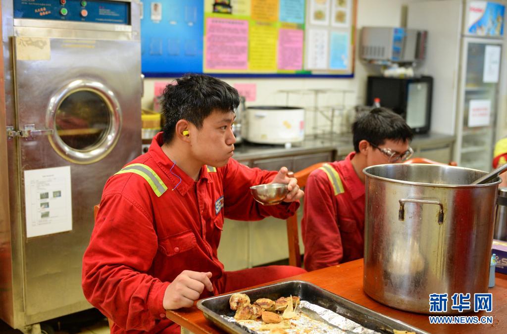 4月25日,中國海油樂東15-1氣田的工人在工間休息時用餐。
