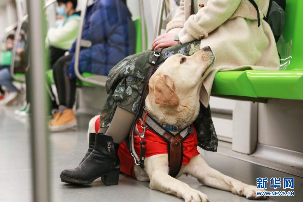 導(dǎo)盲犬“Bingo”陪伴李靜乘坐地鐵(3月27日攝)。 新華社發(fā) (張夢 攝)