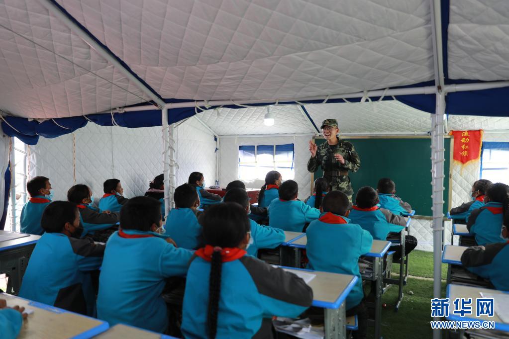5月24日,武警青海總隊(duì)果洛支隊(duì)機(jī)動(dòng)大隊(duì)排長(zhǎng)張國(guó)睿為花石峽鎮(zhèn)藏文中心寄宿制小學(xué)的孩子上課。新華社記者 劉新 攝