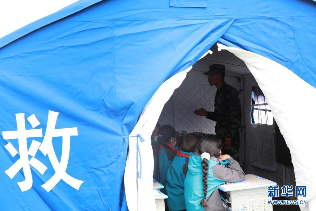 5月24日,武警青??傟牴逯ш牂C(jī)動大隊排長張國睿為花石峽鎮(zhèn)藏文中心寄宿制小學(xué)的孩子上課。新華社記者 劉芳 攝