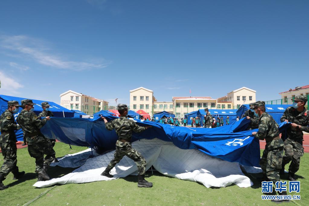 5月24日,武警青??傟牴逯ш牂C動大隊官兵為花石峽鎮(zhèn)藏文中心寄宿制小學搭建帳篷教室。新華社記者 劉芳 攝