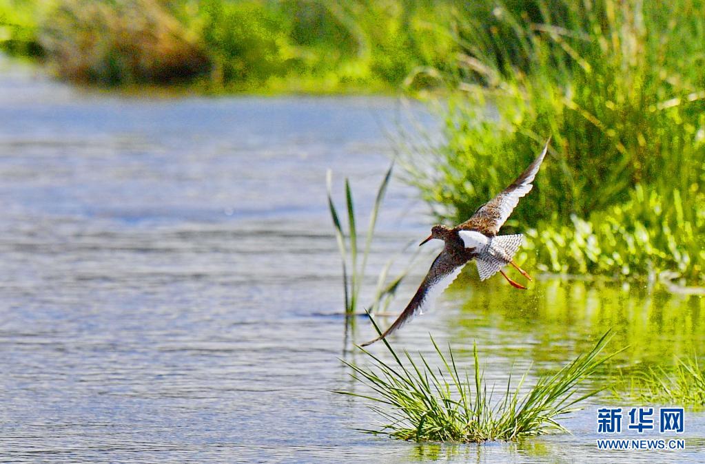 初夏,紅腳鷸在位于西藏拉薩的拉魯濕地國(guó)家級(jí)自然保護(hù)區(qū)內(nèi)起舞覓食。