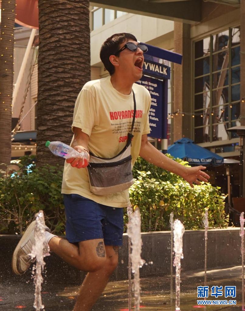 6月16日,美國(guó)加利福尼亞州洛杉磯市民在噴泉旁戲水納涼。加州南部本周迎來今年的首次高溫天氣。