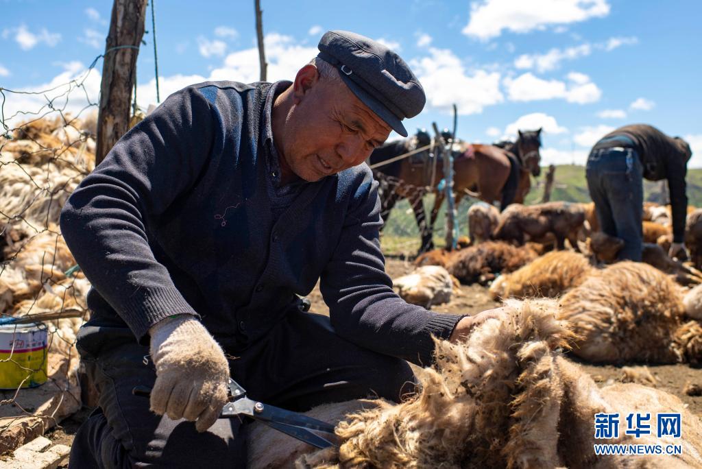 新疆裕民縣的牧民在巴爾魯克山區(qū)夏牧場(chǎng)上剪羊毛(6月15日攝)。