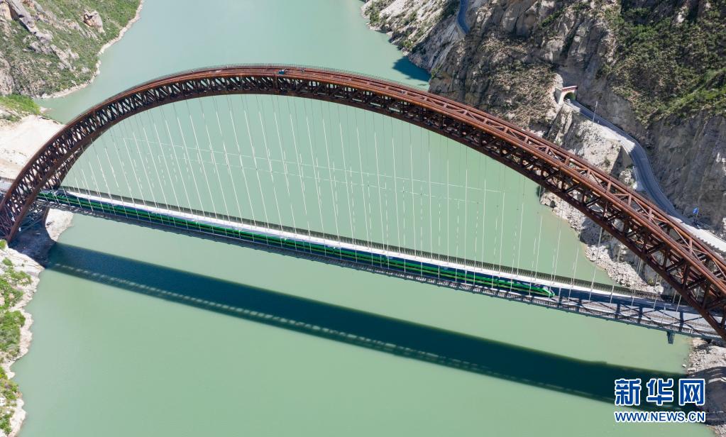 試運行的復興號列車行駛在藏木特大橋上(6月17日攝,無人機照片)。