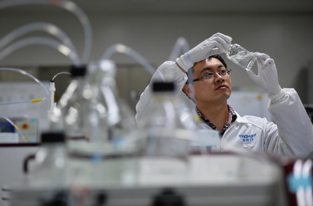 2017年5月9日,江蘇蘇州,在信達生物制藥(蘇州)有限公司研發(fā)實驗室,一名工程師在觀察藥物中間產(chǎn)品外觀。 新華社記者 李響 攝