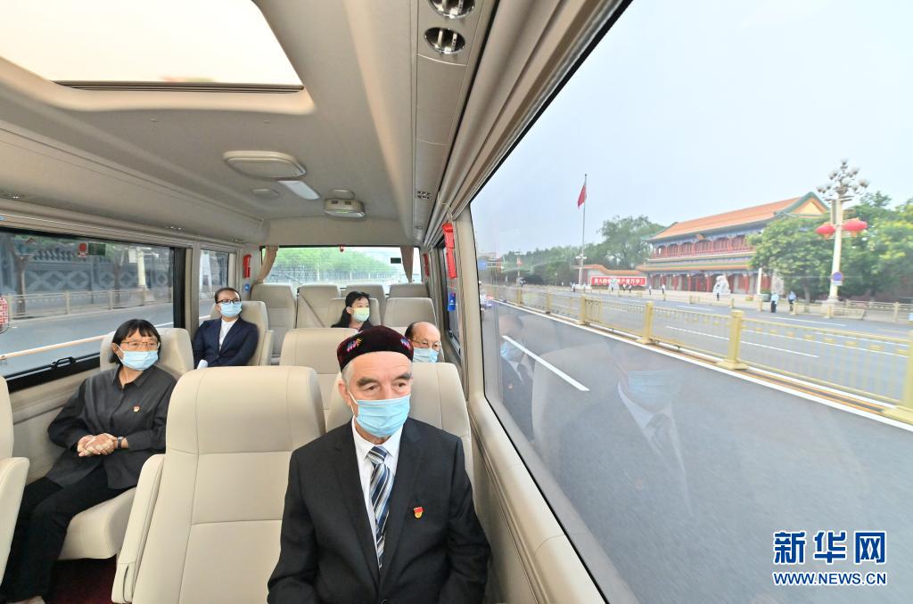 這是買買提江·吾買爾(前)、張桂梅(左一)、吳天一(右一)乘車前往人民大會(huì)堂。