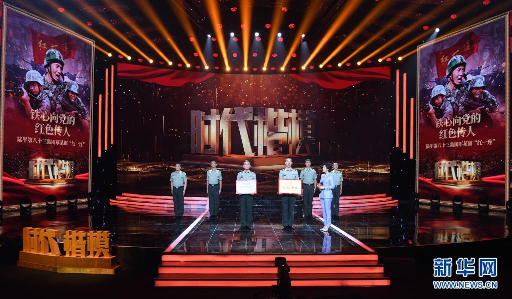 在“時代楷模”發(fā)布儀式上,陸軍第八十三集團軍某旅“紅一連”官兵代表領取“時代楷模”獎牌和證書(7月23日攝)。新華社記者 張永進 攝