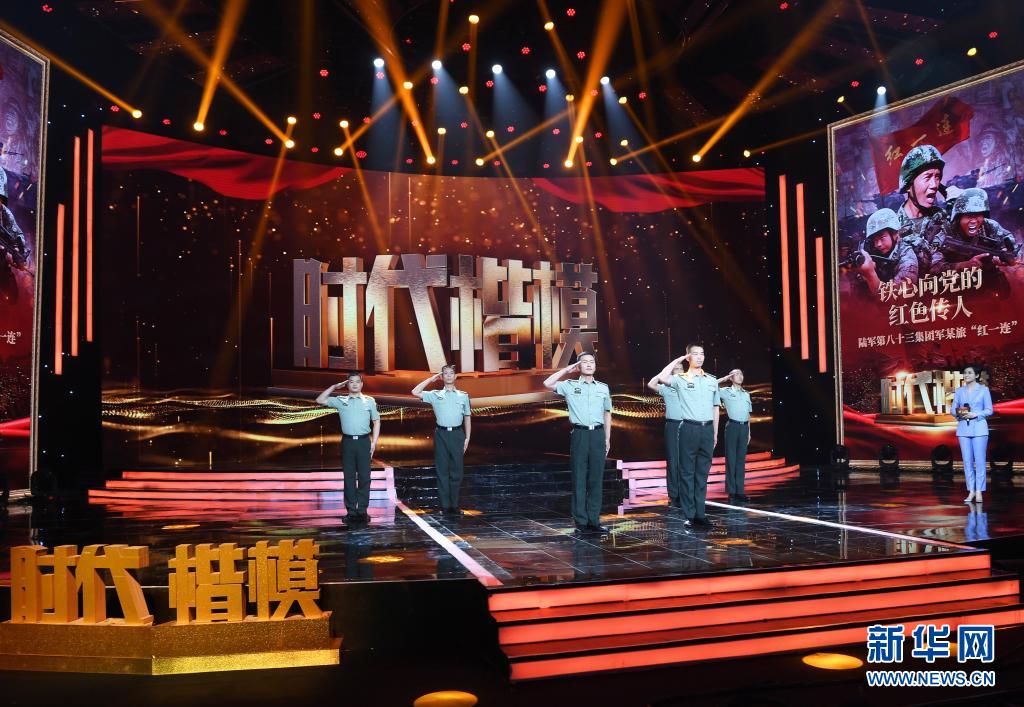 在“時代楷?!卑l(fā)布儀式上,陸軍第八十三集團軍某旅“紅一連”官兵代表表演節(jié)目《紅色堡壘》(7月23日攝)。新華社記者 張永進 攝