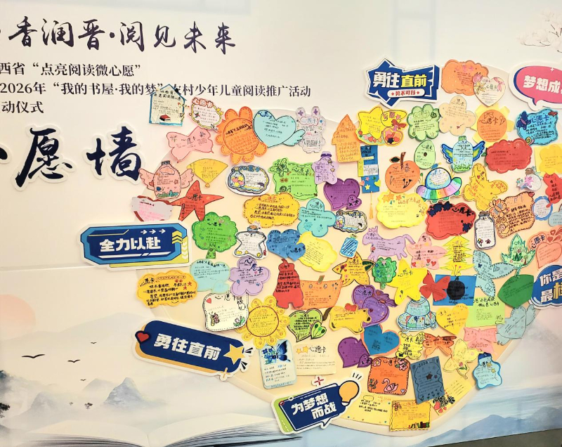 活动现场设置了阅读心愿墙,集中展示孩子们亲手制作的心愿卡片,每一张卡片都承载着对书籍的热切向往。“点亮阅读微心愿”图书漂流活动以山西省农家书屋与农村中小学校为主要阵地,全面打通乡村阅读服务“最后一公里”。活动心愿收集覆盖三晋大地,从最北端长城脚下的三墩村小学,一路向南延伸至位于晋南门户的运城市芮城县,精准收集乡村孩子最真实的阅读期盼。