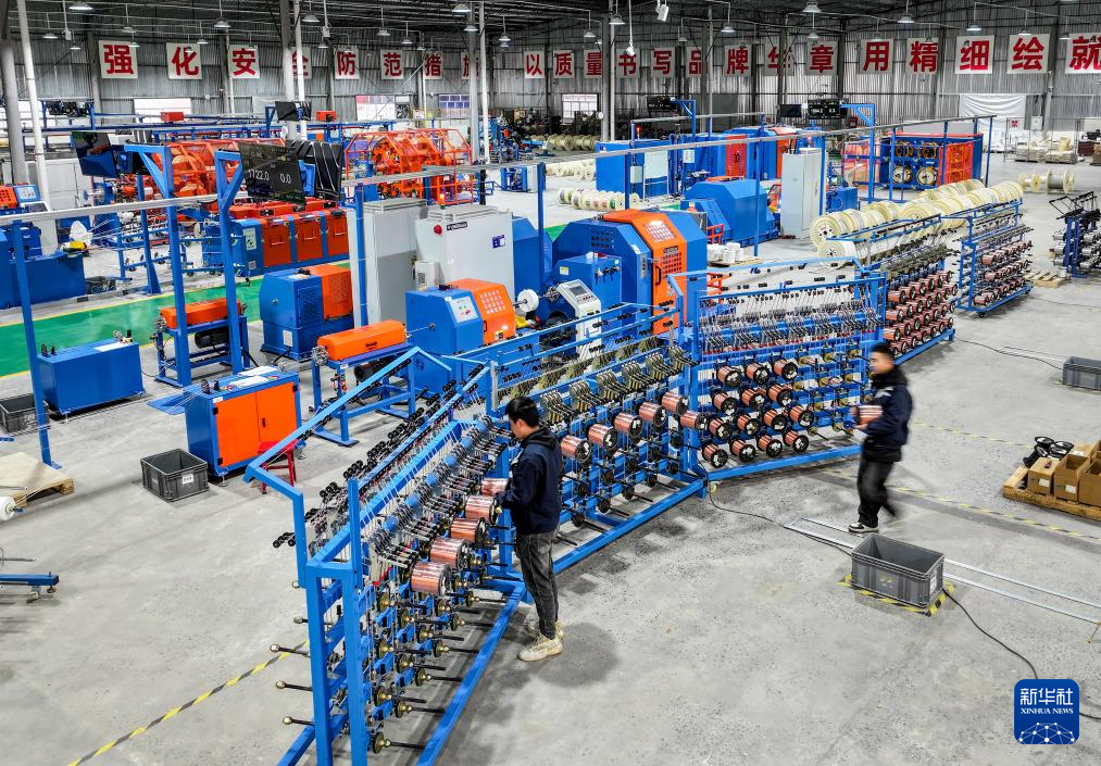 2月24日,在四川省华蓥市华蓥山经开区拓自达电线(四川)有限公司智能车间,工人利用机械设备生产订单产品(无人机照片)。