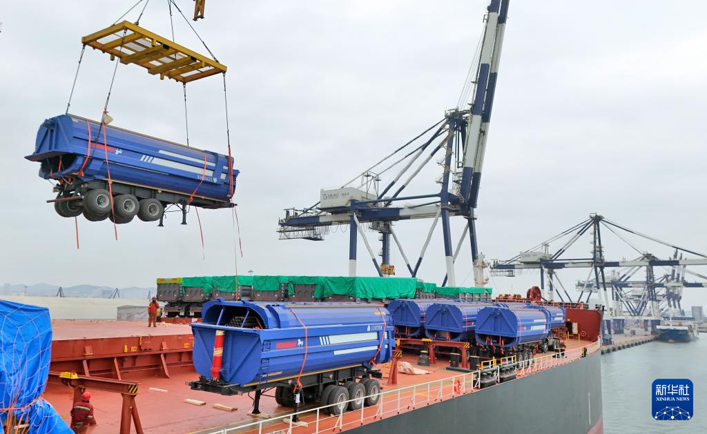 2月24日,在山东港口烟台港,工人将出口卡车吊装上船(无人机照片)。