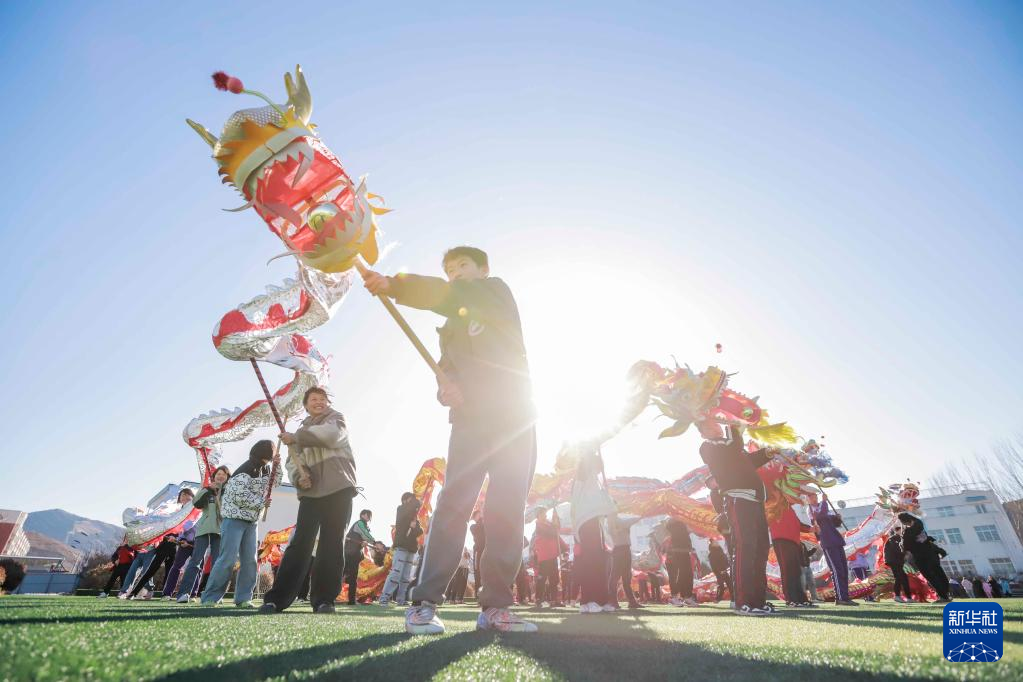 2月20日,河北省遵化市东旧寨镇梁屯中心小学的学生表演舞龙。