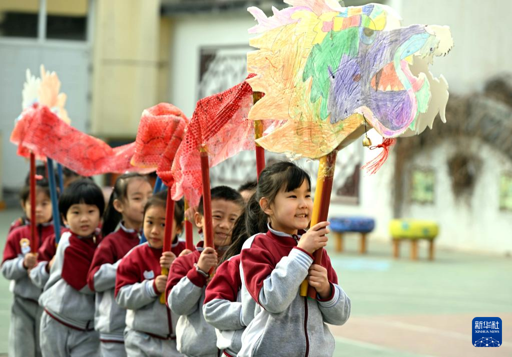 2月21日,小朋友在石家庄市第一实验幼儿园“舞龙”。