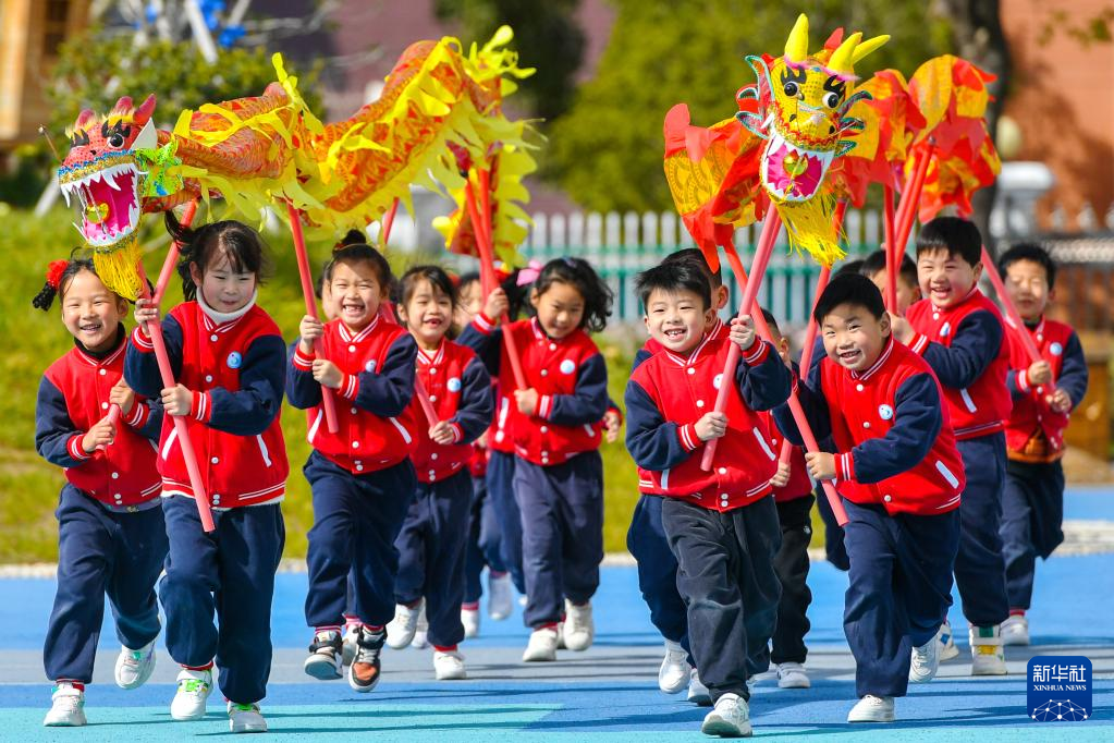 2月21日,浙江省湖州市长兴县夹浦镇中心幼儿园的孩子们体验舞龙。