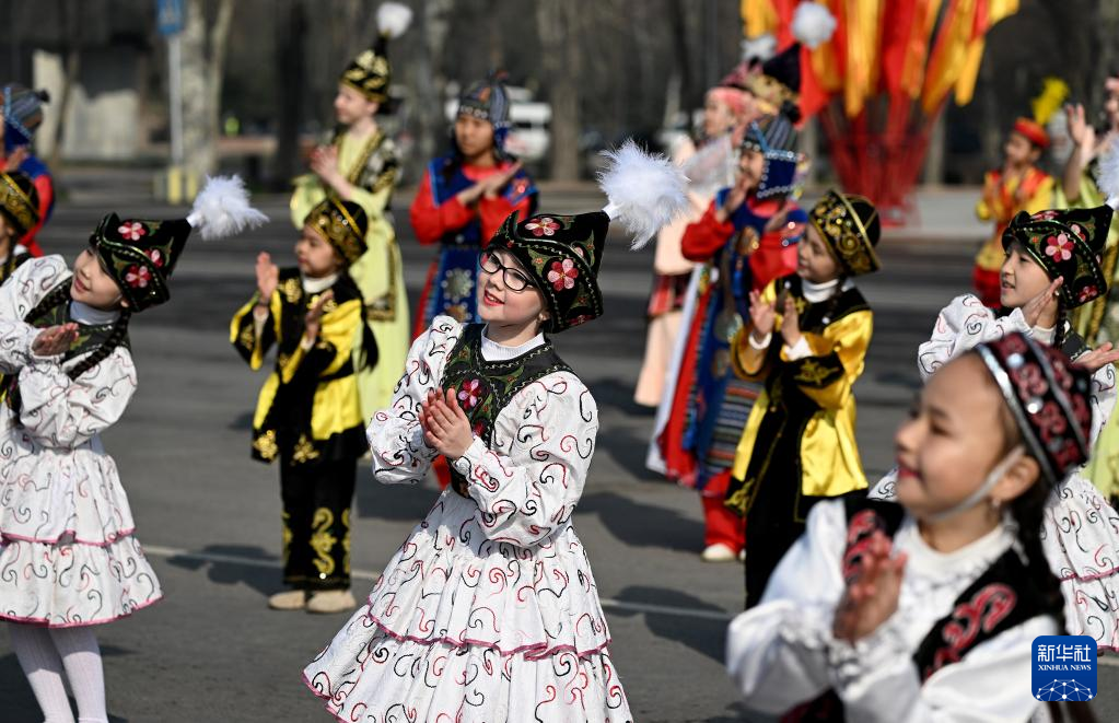 3月21日,人们在吉尔吉斯斯坦首都比什凯克阿拉套广场参加纳乌鲁斯节庆典表演。