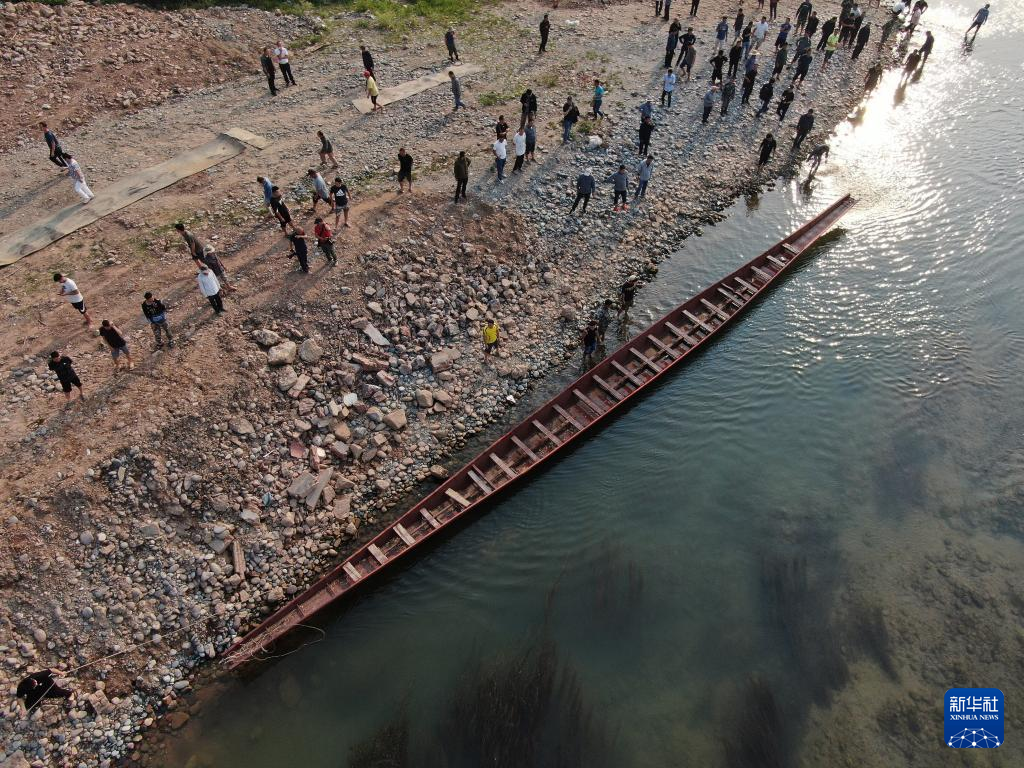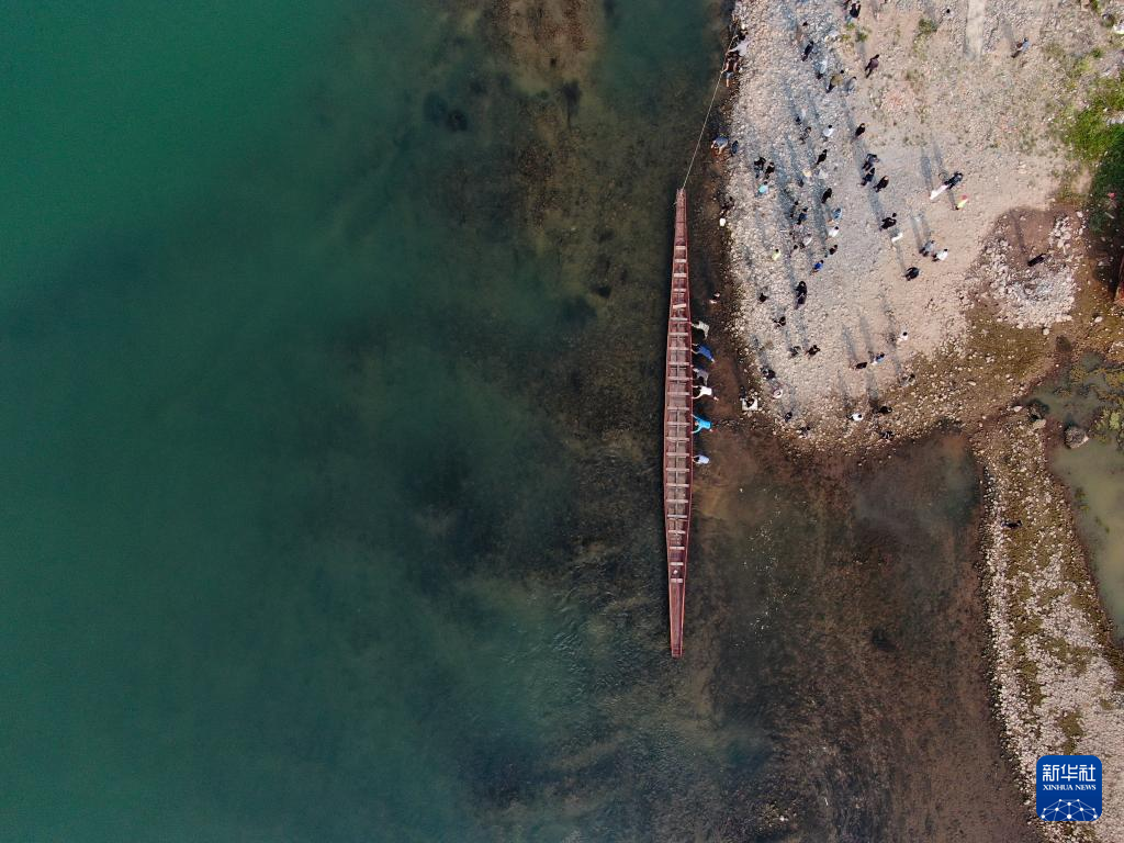 4月1日,景洪市勐罕镇曼听村村民推送龙舟进入澜沧江(无人机照片)。