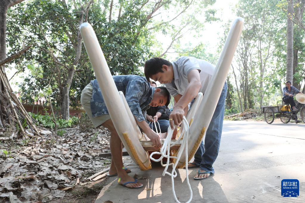 4月1日,景洪市勐罕镇曼搭村村民在为龙舟扎龙头。