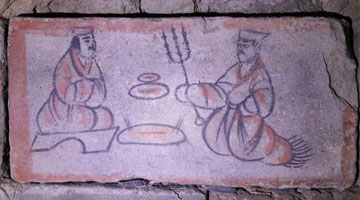 在嘉峪关魏晋墓六号墓的画像砖上,仆人(左)拿着烤肉递给衣着华丽的男主人享用(5月13日摄)。