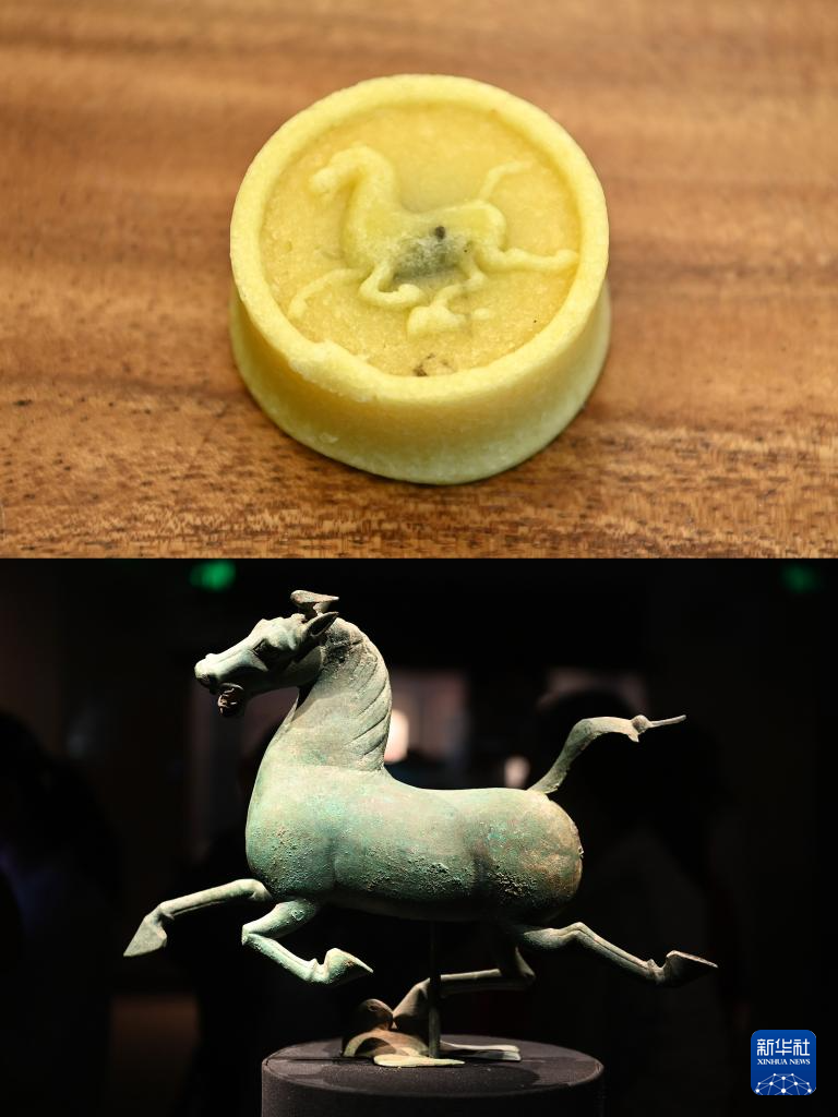 拼版照片:上图为铜奔马绿豆糕(5月18日摄);下图为甘肃省博物馆展出的铜奔马(5月18日摄)。