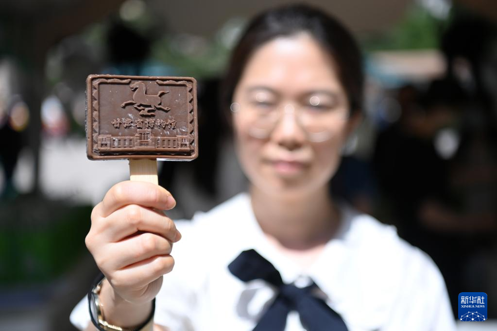 5月18日,在甘肃省博物馆,工作人员展示甘博巧克力雪糕。