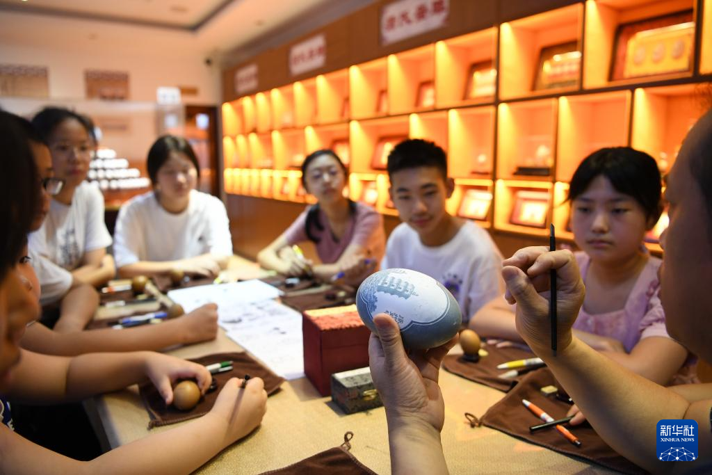 7月15日,河北涿州蒲氏蛋雕非遗传承人蒲德荣(右三)为学生讲解蛋雕制作技艺。