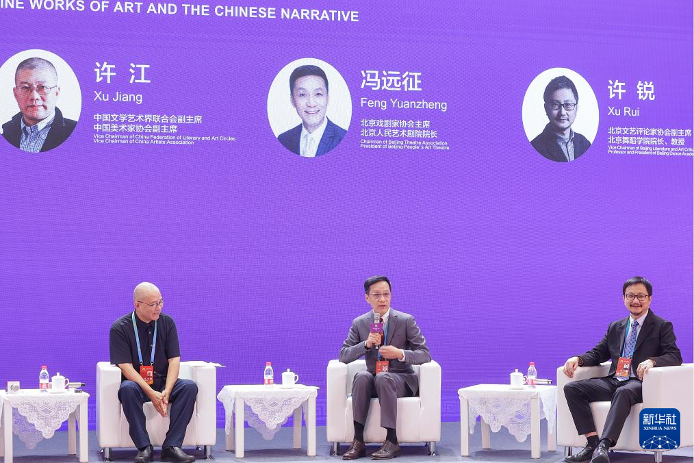 9月15日,北京人民艺术剧院院长冯远征(中)在“以文化人:文艺价值与社会生活”平行论坛的“文艺精品与中国叙事”圆桌对话现场发言。