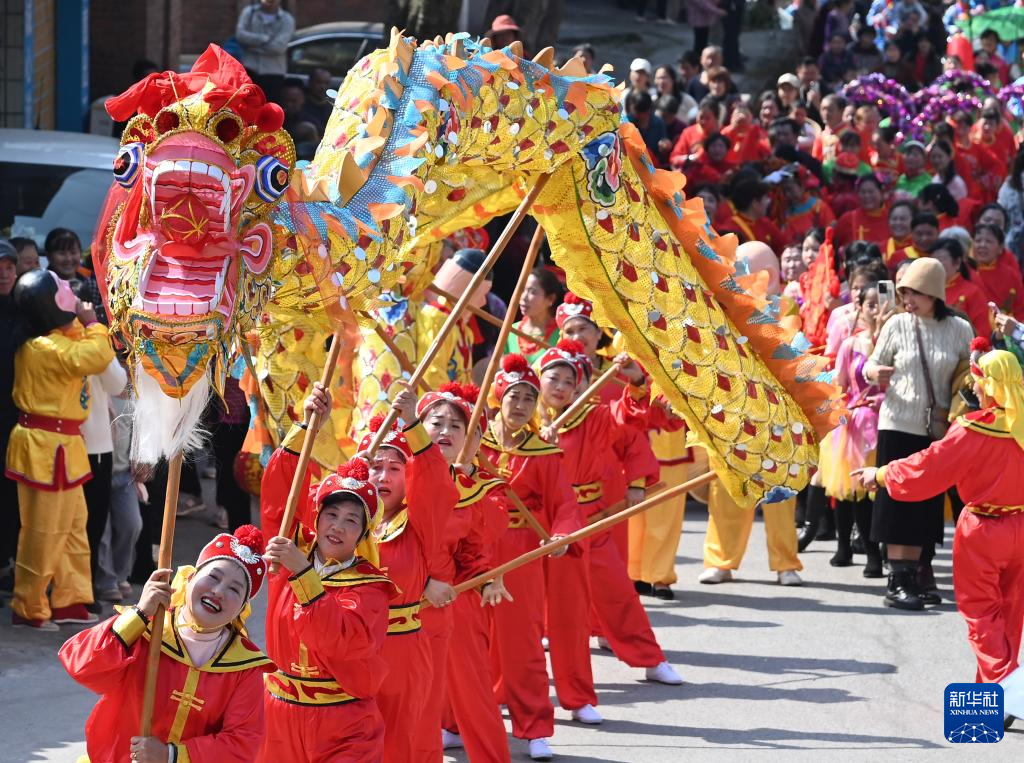 2月19日,在河北省沧县旧州镇贾村,演出队伍在表演舞龙。