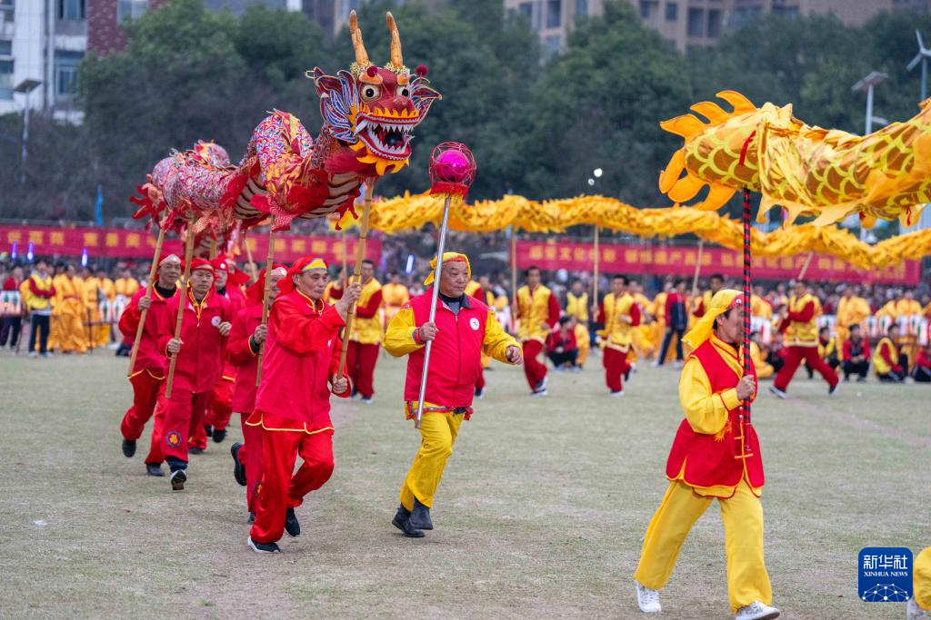 3月16日,民间演员在慈利县人民广场表演舞龙(无人机照片)。