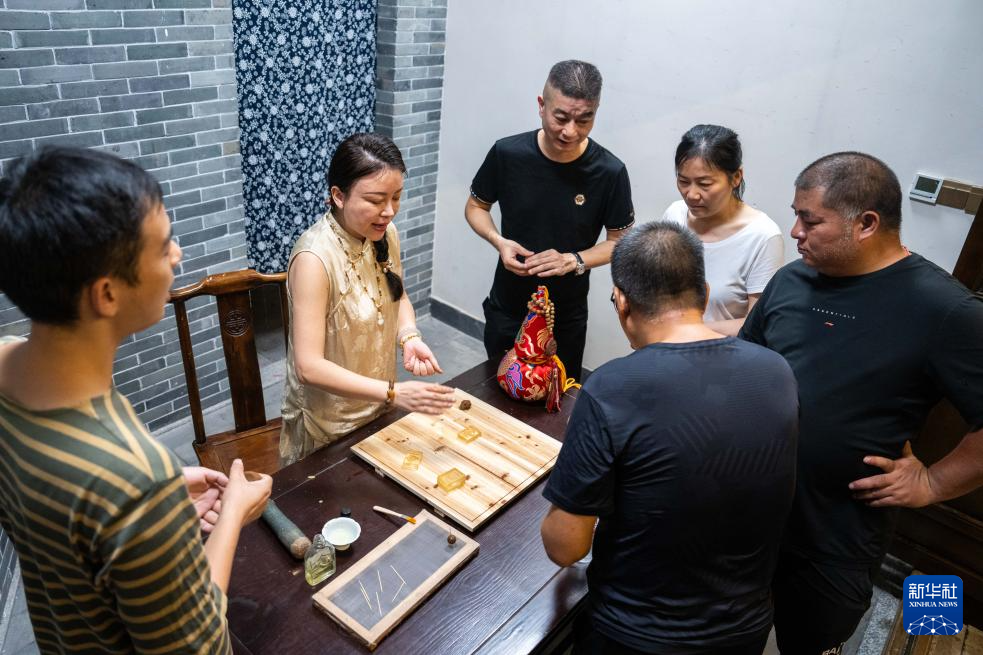 9月3日,在常德河街,传统香制作技艺非遗传承人钟玲(左二)向游客讲解熏香制作。
