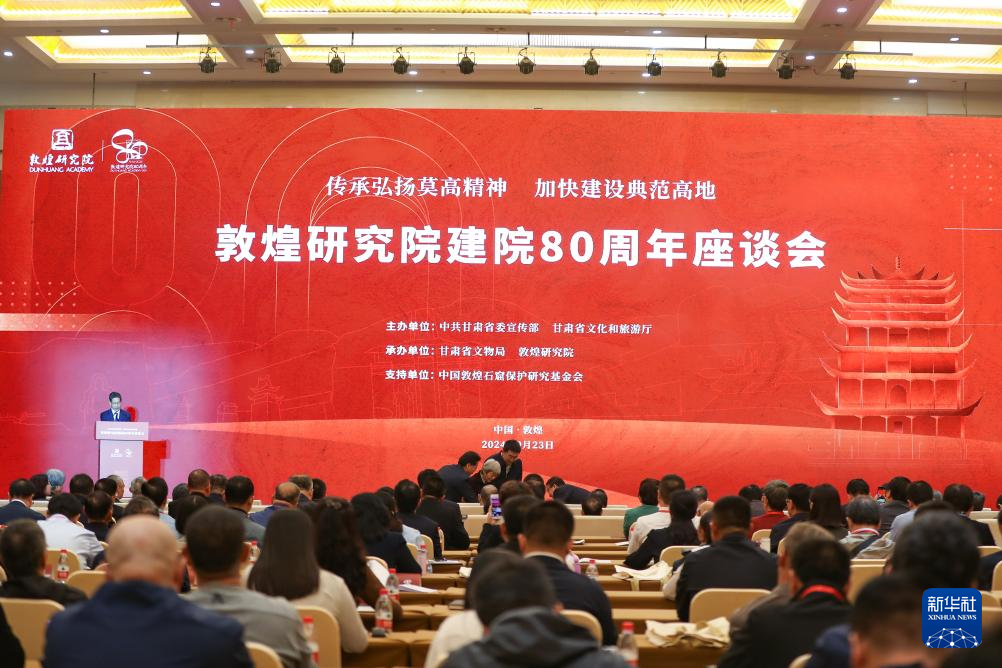 当日,以“传承弘扬莫高精神 加快建设典范高地”为主题的敦煌研究院建院80周年座谈会在甘肃省敦煌市举行。来自敦煌研究院、国家文物局、甘肃省有关部门、国内高校、文博单位以及国内外合作机构的近400名代表参加座谈会。