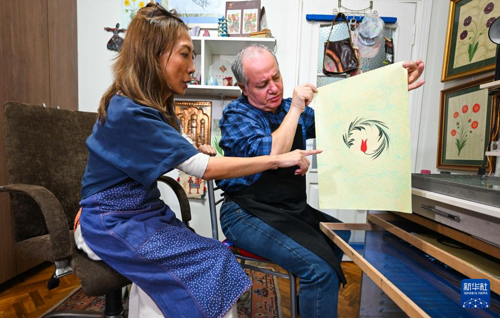 11月1日,在土耳其伊斯坦布尔,李昕桐(左)在老师埃罗尔的家中请教水拓画相关问题。