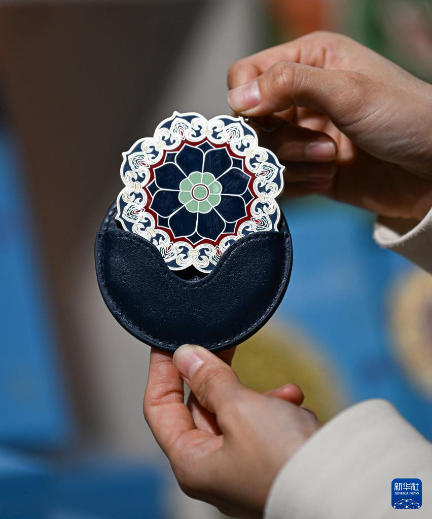 12月29日,工作人员在位于海口的山海轩文创空间展示敦煌繁花化妆镜。