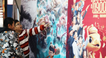 2月4日,在山东省临沂市郯城县一家影城,等待观影的观众在观看电影海报。