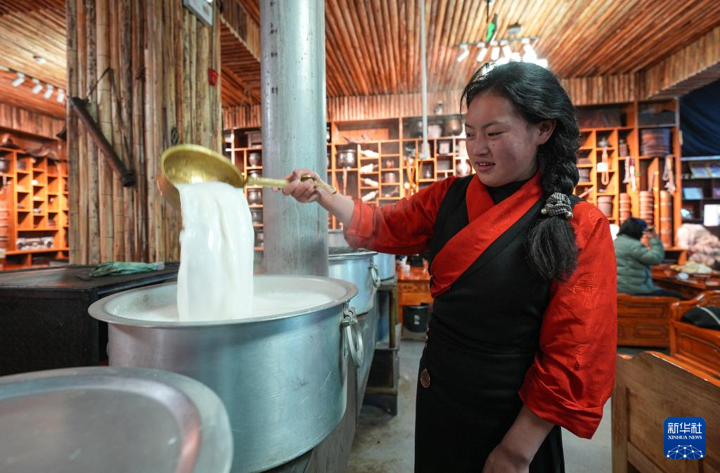 “牧人宝库”藏式茶馆服务员在熬制奶茶(2月13日摄)。