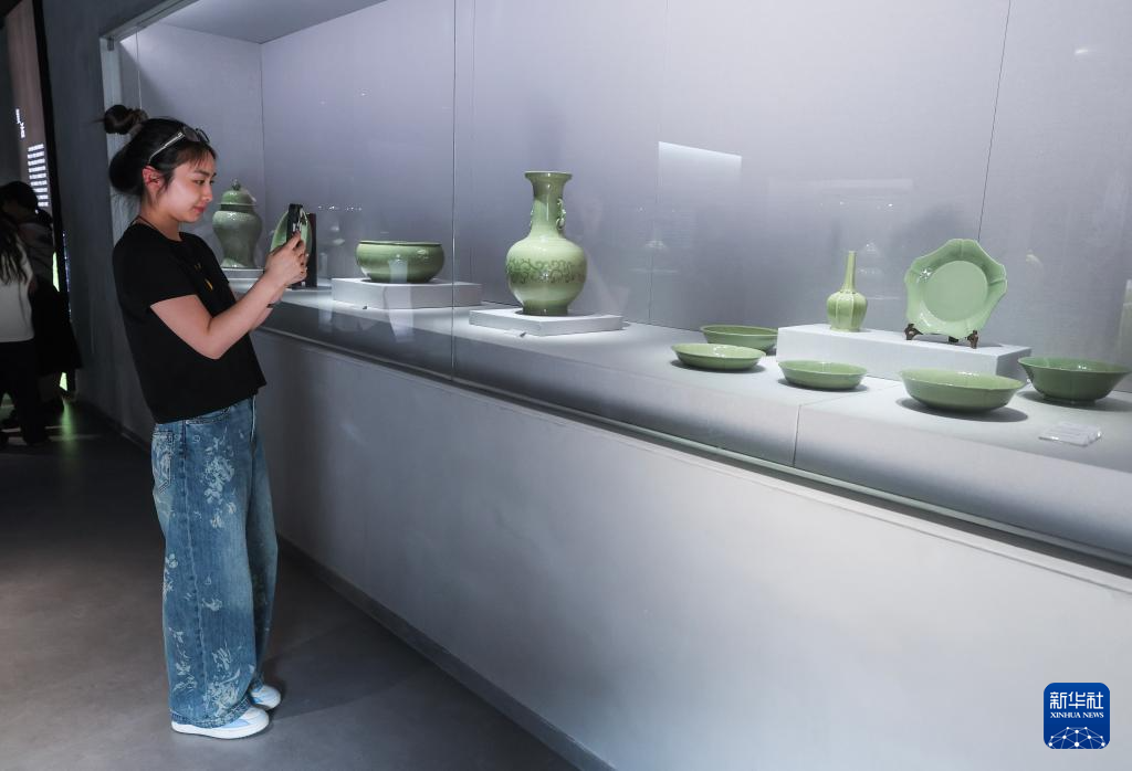 4月9日,游客在施山社区施家山公共文化空间的越窑青瓷施珍艺术馆内参观拍照。