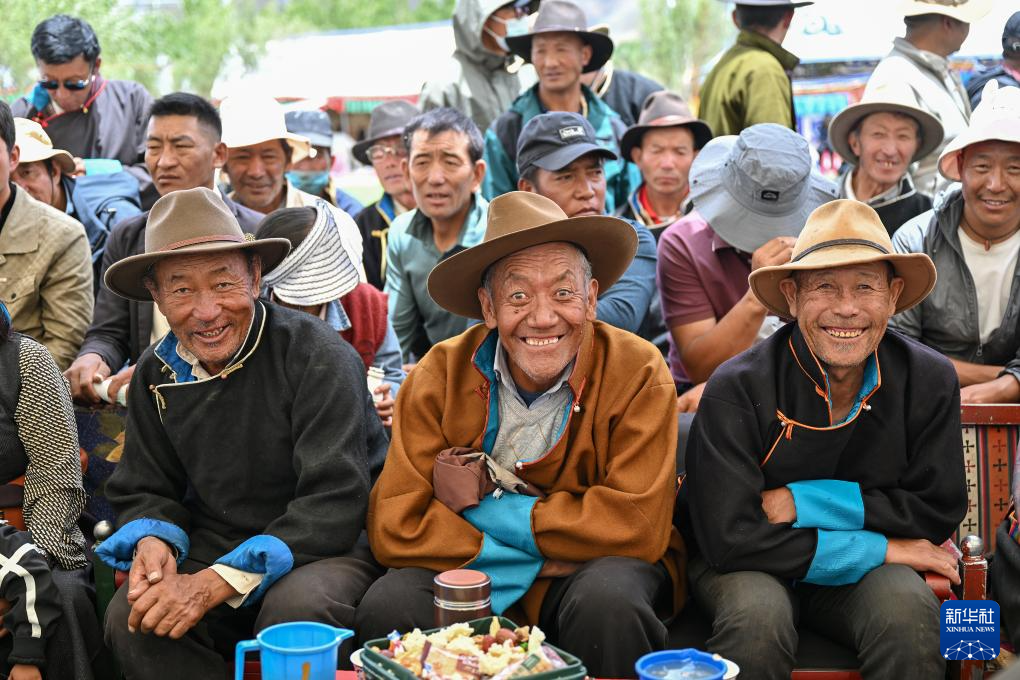 7月16日,76岁的湘巴藏戏国家级非遗传承人次仁多吉(右二)在南木林县非遗公园内给即将表演湘巴藏戏的小演员整理服装。