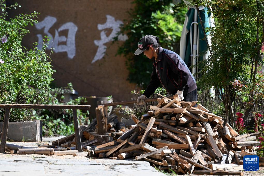 9月19日,村民在阳产村劈柴。