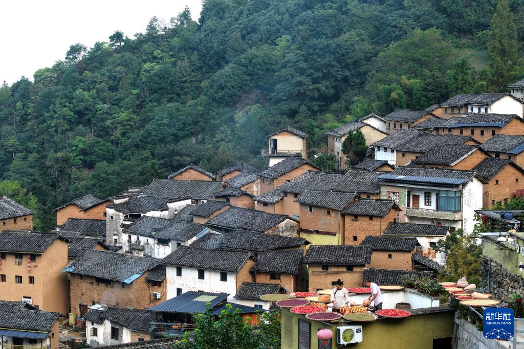 时值秋收时节,村民们利用晴好天气,将辣椒、玉米、山核桃等农作物晾晒在房前屋后,形成独具特色的“晒秋”景观。