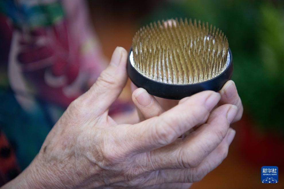9月29日,在安徽农业大学林学与园林学院徽派插花艺术传承基地,付玉兰展示插花固定用具“剑山”。
