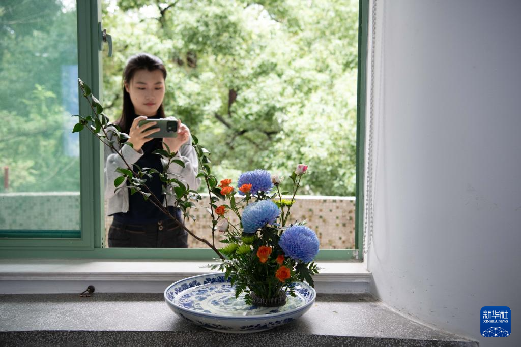 9月30日,在安徽农业大学林学与园林学院徽派插花艺术传承基地,一名大学生在拍摄付玉兰创作的插花作品。