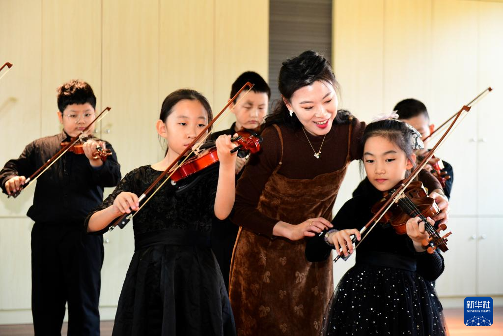 11月26日,在济南市市中区泉海小学,音乐老师夏霄霏在指导学生拉小提琴。