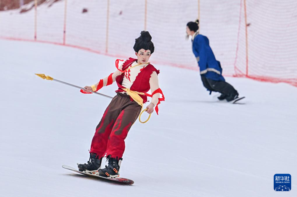 12月8日,一名装扮成哪吒的表演者在阿坝州汶川县羌人谷滑雪场进行滑雪表演。