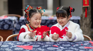2月4日,在安华镇丰江周村的宗祠,村民在制作板凳龙花灯上的剪纸装饰。