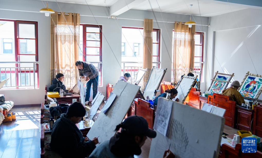 2月10日,学徒在西藏唐卡画院的教室里画唐卡。